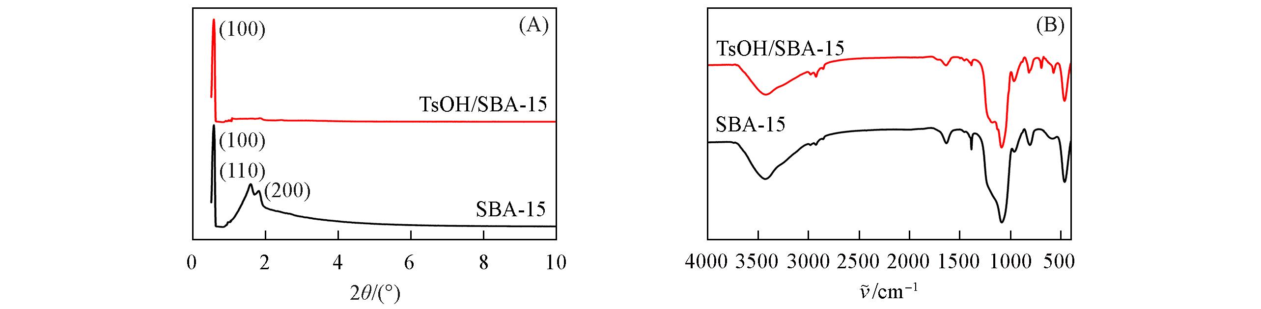 | Fig.2 XRD patterns(A) and FTIR spectra(B) of SBA⁃15 and TsOH/SBA⁃15 |