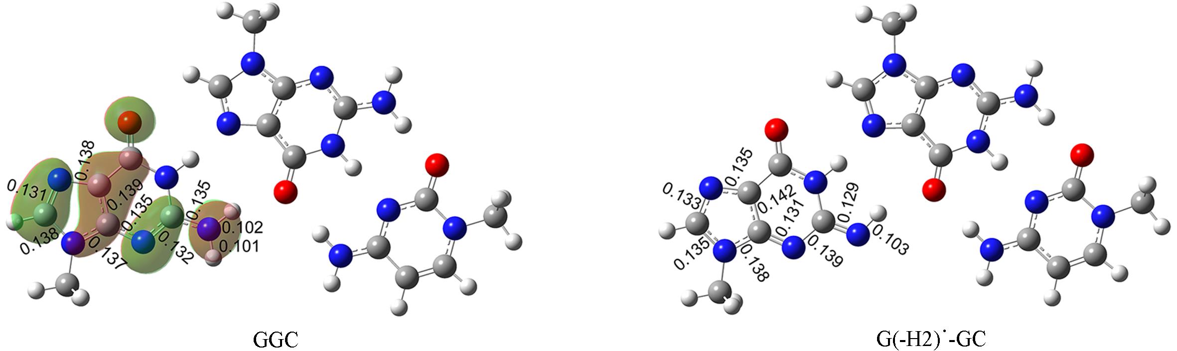 | Fig.2 Optimized geometries of GGC and G(⁃H2)•⁃GC, the HOMO of GGC obtained at IEFPCM/M06⁃2X/6⁃31++G(d, p) level of theory Oxygen, nitrogen, carbon and hydrogen atoms are denoted with red, blue, gray and white balls, respectively. The unit of bond distance is nm. |