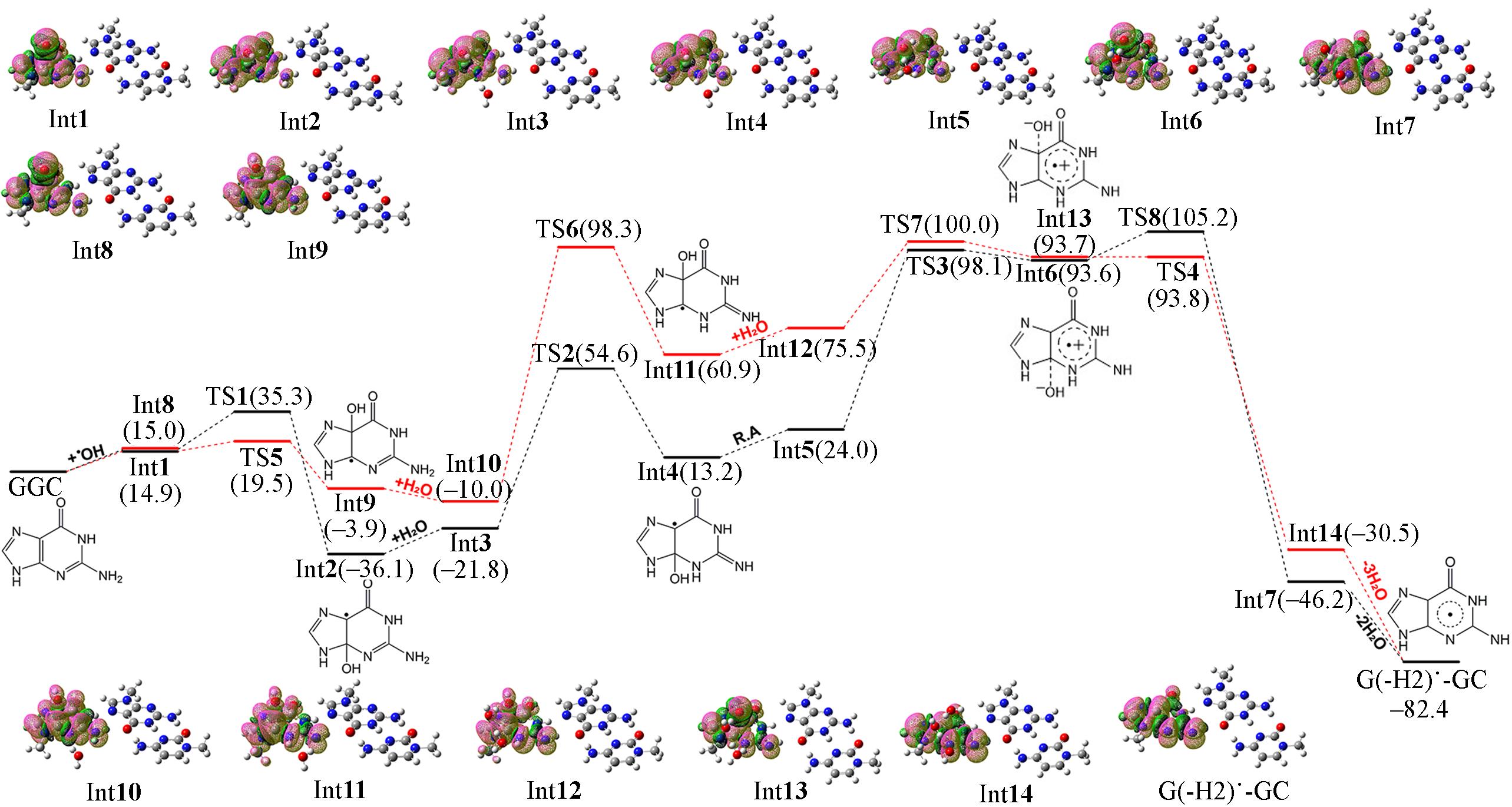 | Fig.3 Spin density and relative energy(kJ/mol) for related species along with C4(black) and C5 pathway(red) obtained at IEFPCM/M06⁃2X/6⁃31++G(d, p) and IEFPCM/M06⁃2X/6⁃311++G(d, p) level, respectively The structural formulas in the curves are derived from the oxidized G. |