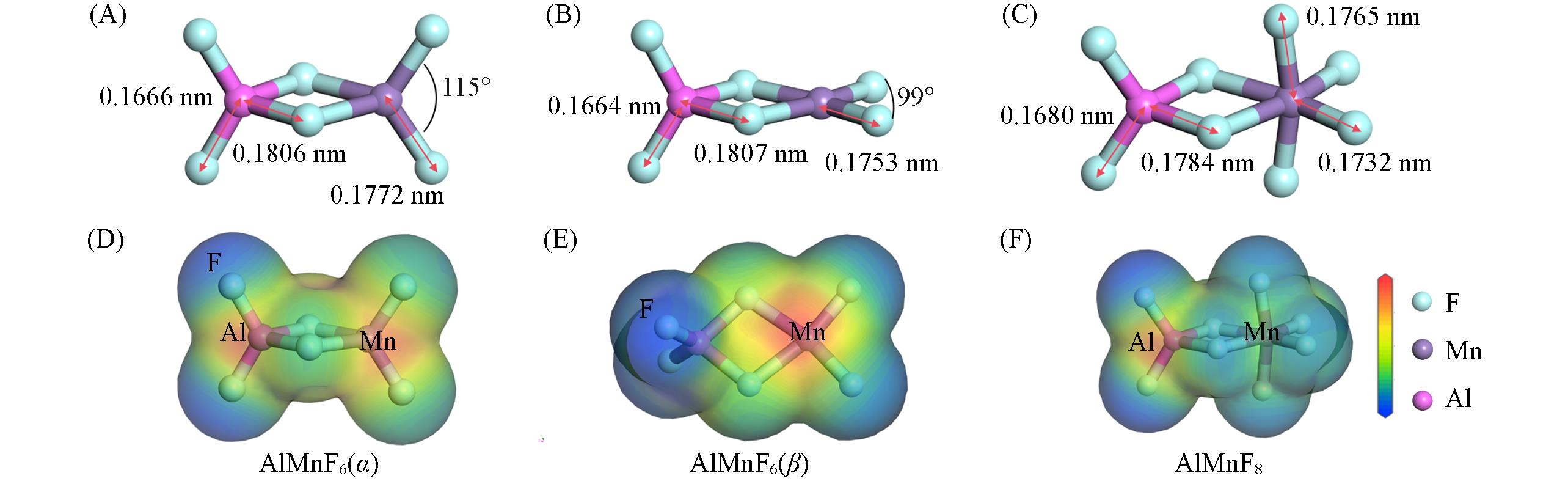 | Fig.8 Structures(A—C) and electrostatic potentials(D—F) of AlMnF6(α)(A, D), AlMnF6(β)(B, E) and AlMnF8(C, F) |