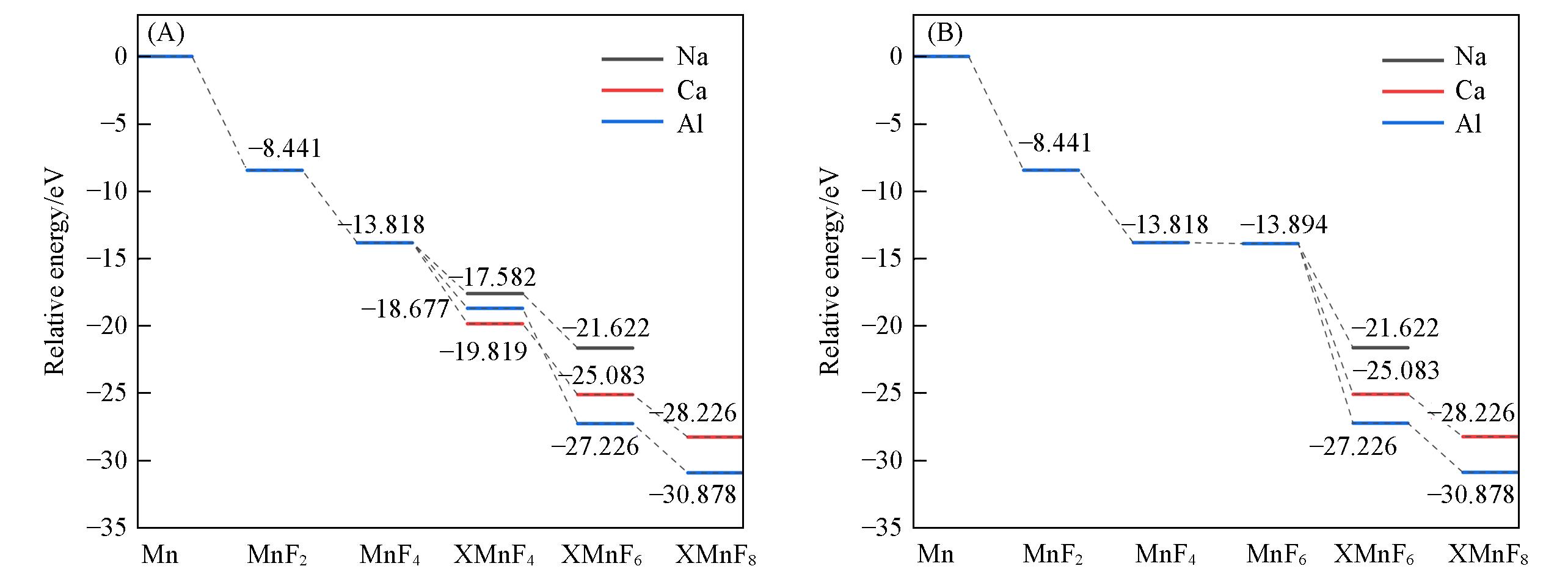 | Fig.10 Relative energy differences of reaction stage products of the tetrahedral MnF4(A) and MnF6(B) |