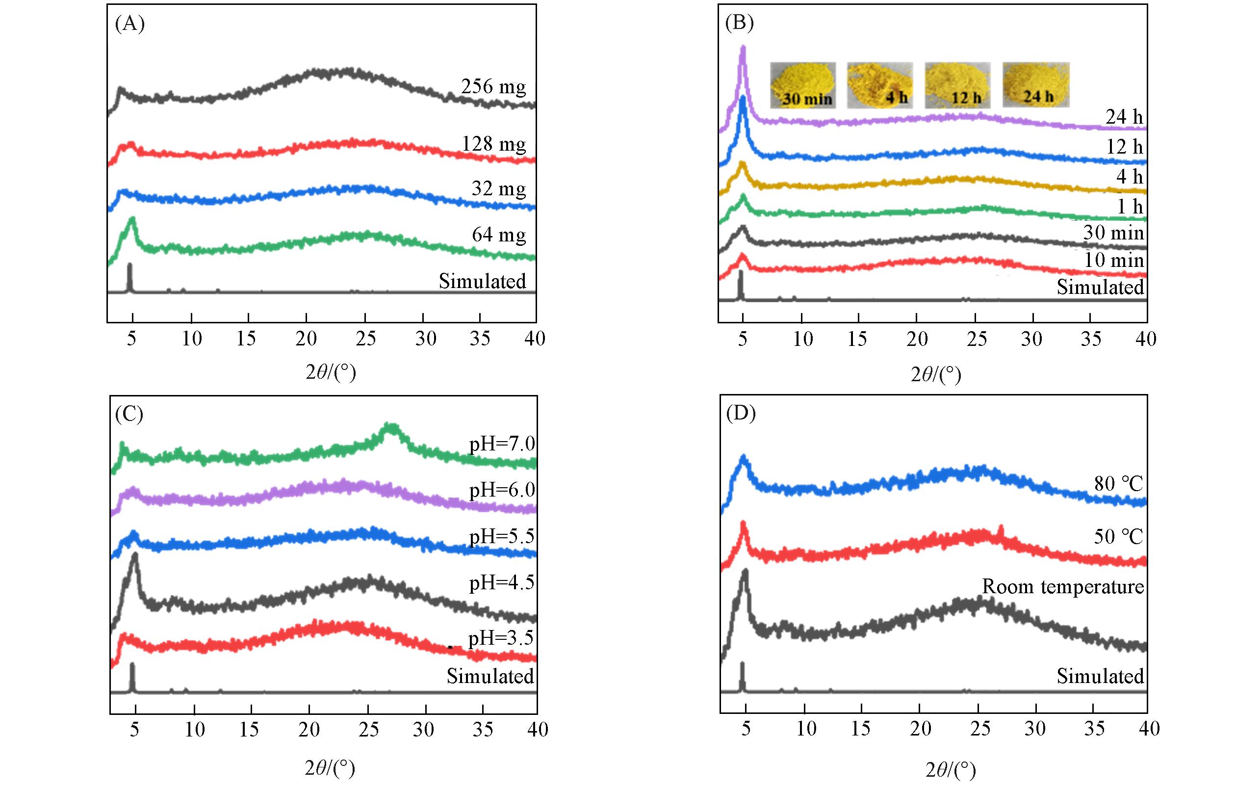 | Fig.1 PXRD patterns of COF⁃LZU1 synthesized at different concentrations(A), at different reaction times(B), in different pH values of acetate buffer(C), and at different temperatures(D) Insets in (B) are the digital photos of the samples prepared at different time. |