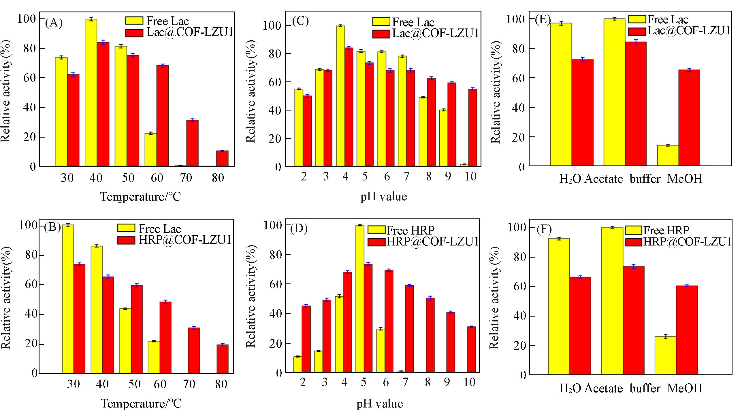 | Fig.4 Relative activity of free Lac and Lac@COF⁃LZU1(A), free HRP and HRP@COF⁃LZU1(B) at different temperatures, relative activity of free Lac and Lac@COF⁃LZU1(C), free HRP and HRP@COF⁃LZU1(D) at different pH values, relative activity of free Lac and Lac@COF⁃LZU1(E), free HRP and HRP@COF⁃LZU1 in different environments(F) |