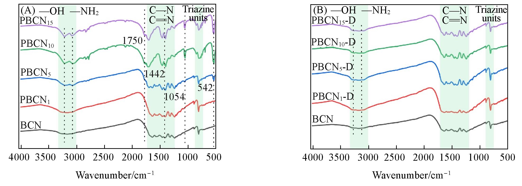 | Fig.2 FTIR spectra of BCN, PBCN x (x=1, 5, 10, 15)(A) and BCN and PBCN x ⁃D(x=1, 5, 10, 15)(B) |