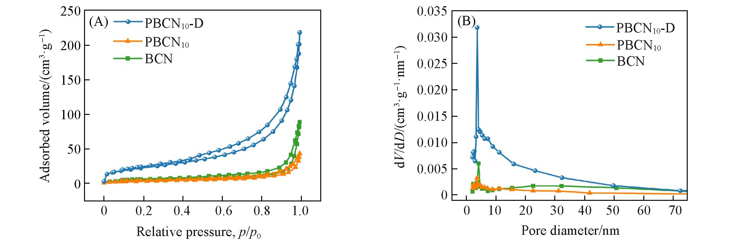 | Fig.5 N2 adsorption⁃desorption curves(A) and pore size distributions(B) of the BCN, PBCN10 and PBCN10⁃D |