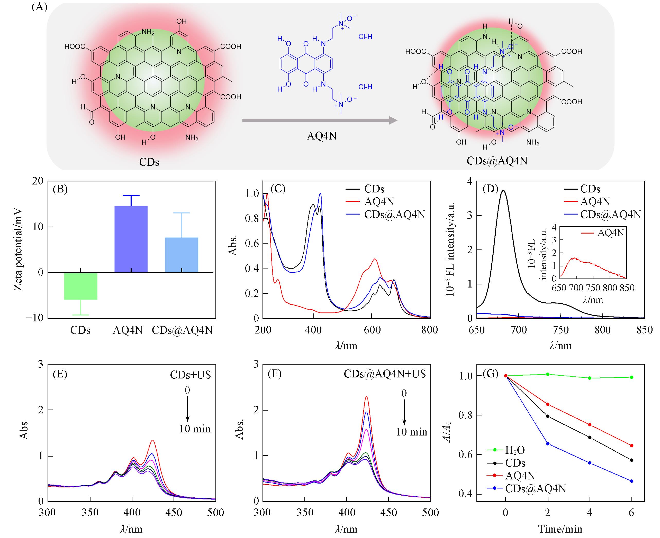 | Fig.2 Assembly of CDs with AQ4N and the 1O2 generating capacity assay (A) The schematic representation of the self-assembly of CDs and AQ4N through hydrogen bonding, π-π interactions and electrostatic interactions; (B) Zeta potential diagram of CDs, AQ4N and CDs@AQ4N; (C) Normalized UV-Vis absorption spectra; (D) fluorescence spectra of CDs(black), AQ4N(red) and CDs@AQ4N(blue); absorption spectra of ABDA-Na2 in the presence of CDs(E) and CDs@AQ4N(F) under US irradiation(1.0 W·cm-2, 100% duty cycle, 1 MHz, 10 min); (G) the absorption decay rate of ABDA-Na2. |