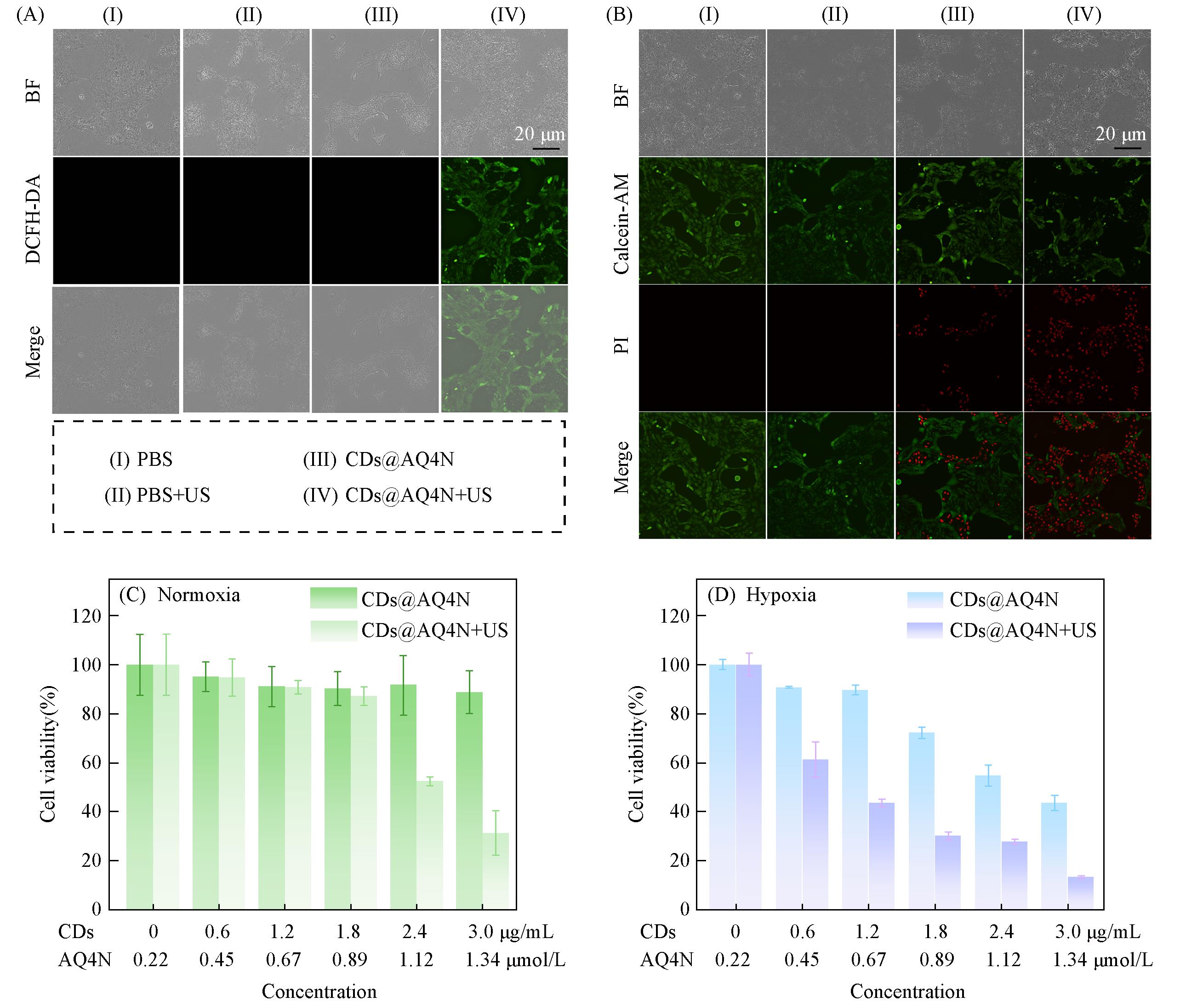 | Fig.3 In vitro cellular experiments in different treatment groups Fluorescence images of 4T1 cells were stained using DCFH-DA probe(A) or Calcein AM/PI(B) after different treatments; the viability of 4T1 cells was incubated using different concentrations of CDs@AQ4N in normoxic(C) and hypoxic condition(D) with or without US irradiation(1.0 W/cm2, 100% duty cycle, 30 s). |