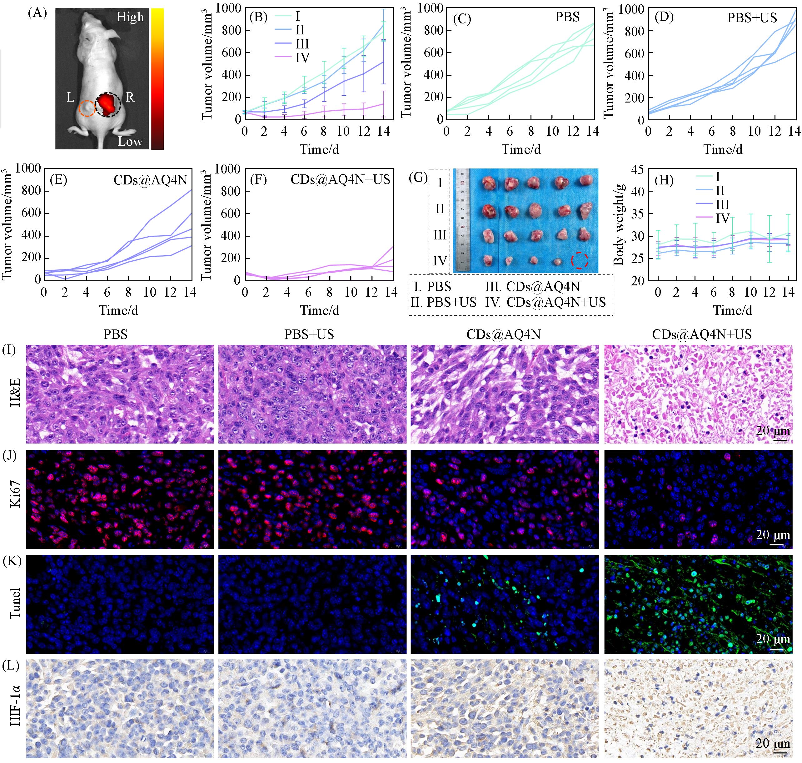 | Fig.4 In vivo animal experiments in different treatment groups (A) Fluorescence imaging picture of mice after intratumoral injection of CDs@AQ4N(L: left tumor, R: right tumor; Ex=600 nm, Em=670 nm); (B—F) variation of tumor volume of different treatment groups; (G) photographs of tumors of different treatment groups after the end of treatment(n=5); (H) variation of body weight of mice in different treatment groups; tumor tissue of mice in different treatment groups H&E(I), Ki67(J), TUNEL(K) and HIF-1α(L) section staining images. |