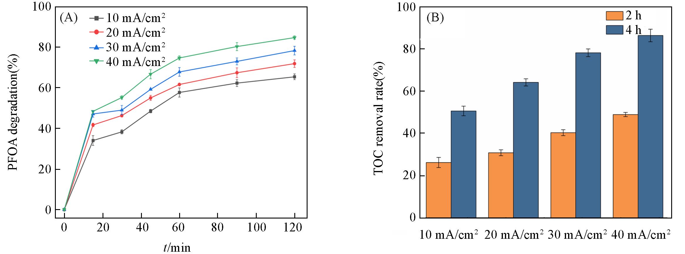 | Fig.5 Degradation rate(A) and TOC removal rate(B) of PFOA at different current densities |