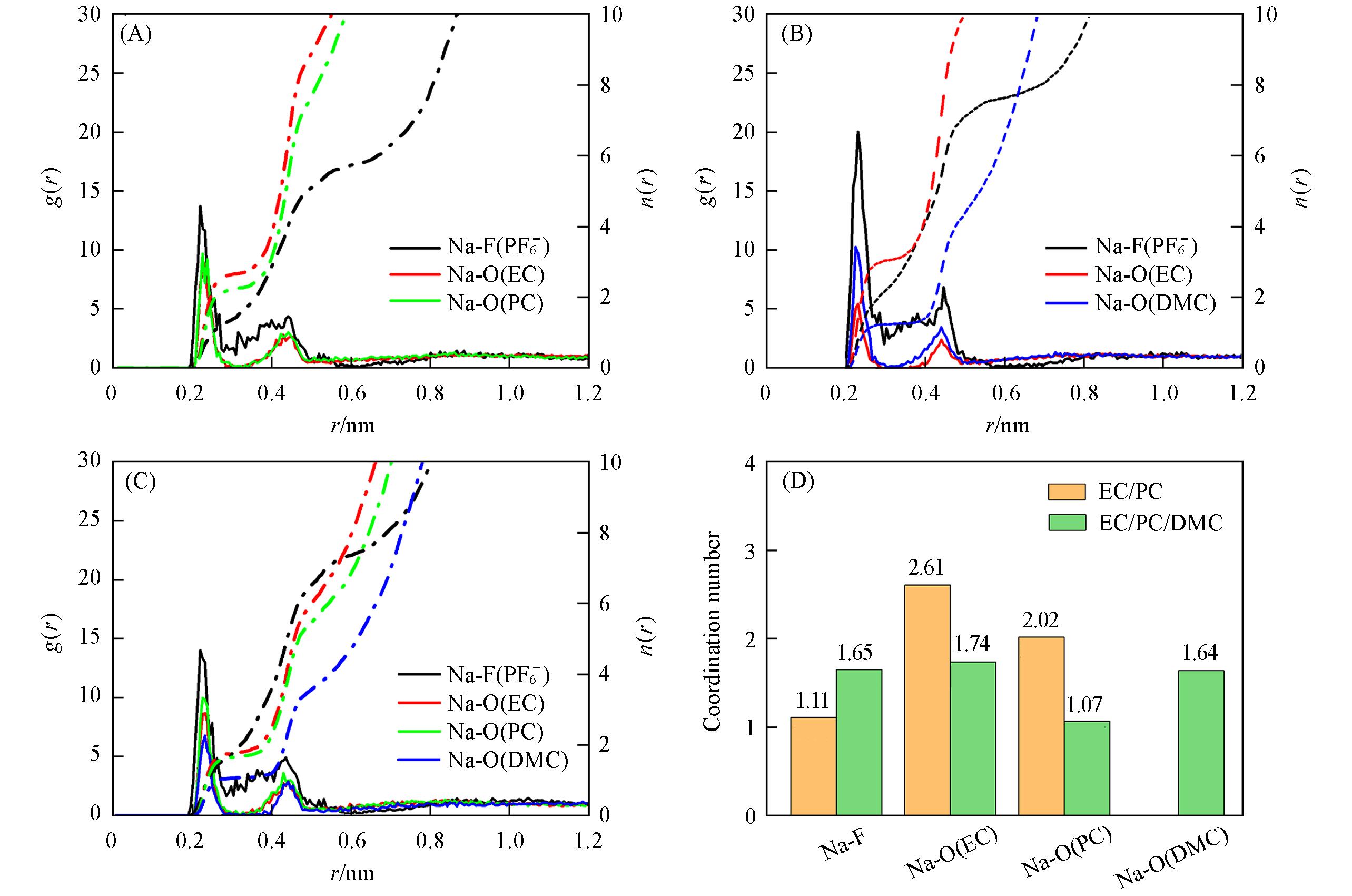 | Fig.5 Radial distribution functions of EC/PC(A), EC/DMC(B), EC/PC/DMC(C), and coordination numbers of EC/PC and EC/PC/DMC(D) |