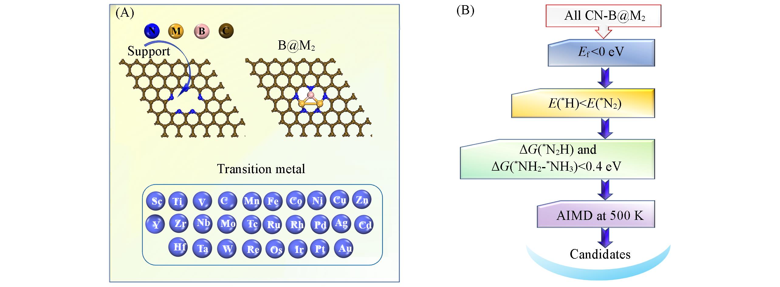 | Fig.1 Modeling details(A) and screening procedures(B) of CN⁃B@M2 catalysts AIMD: Ab initio molecular dynamics. |