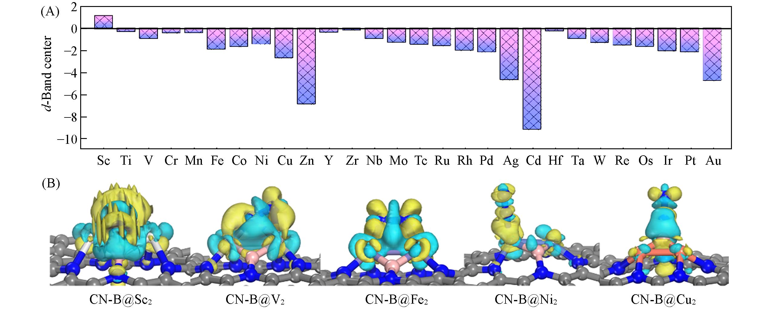 | Fig.3 d Band centers for all catalyst(A), differential charge density distribution of N2 after adsorption to CN⁃B@Sc2, CN⁃B@V2, CN⁃B@Fe2, CN⁃B@Ni2 and CN⁃B@Cu2(B) |