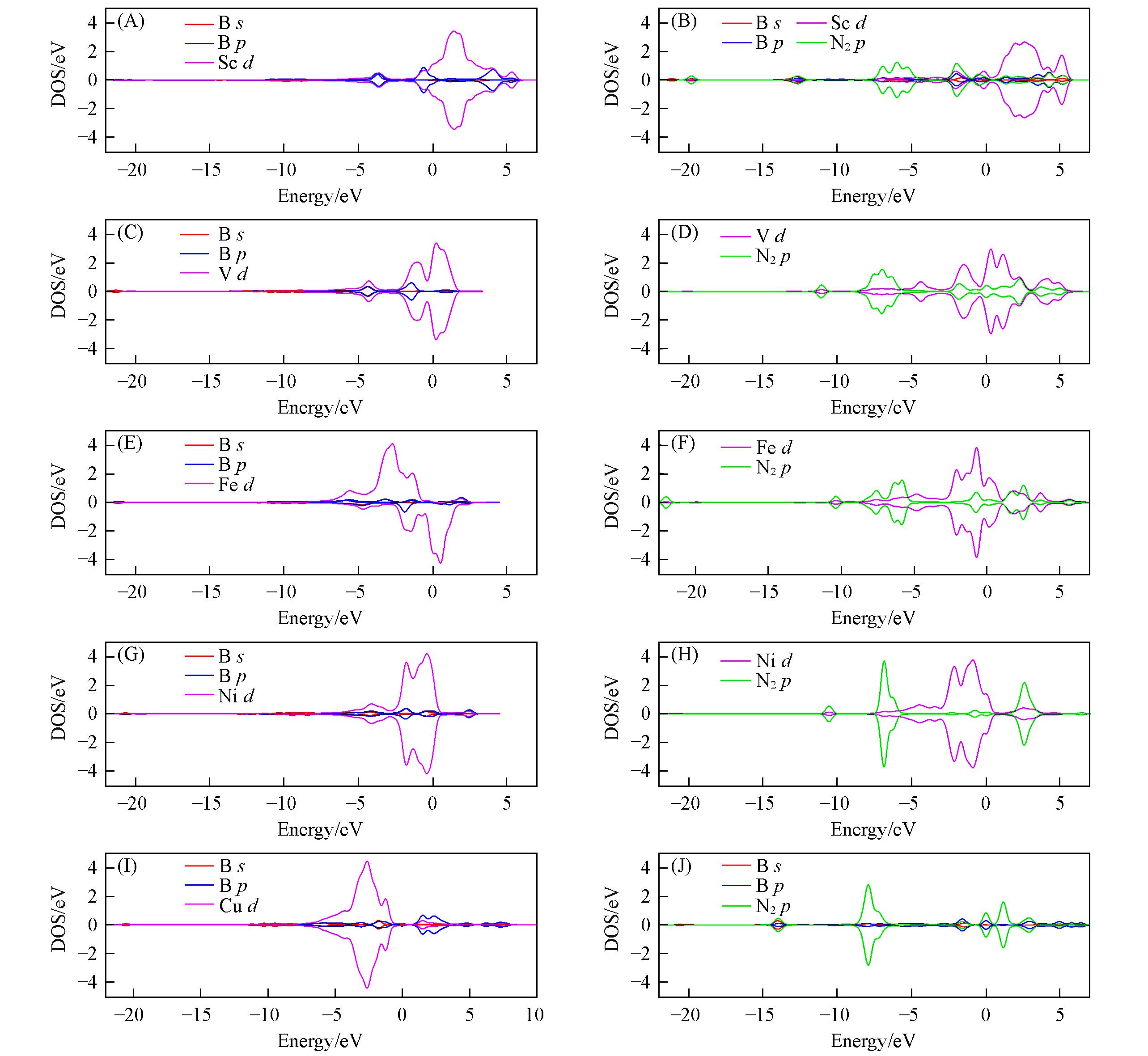 | Fig.4 Density of states(DOS) of N2 before(A, C, E, G, I) and after(B, D, F, H, J) adsorption on CN⁃B@Sc2(A, B), CN⁃B@V2(C, D), CN⁃B@Fe2(E, F), CN⁃B@Ni2(G, H) and CN⁃B@Cu2(I, J) catalysis |