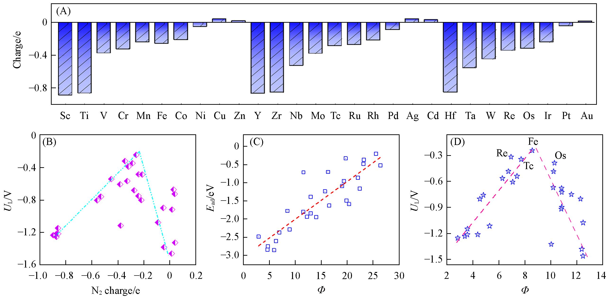 | Fig.7 Mulliken charge of adsorbed N2(A), volcanic relation between UL and |